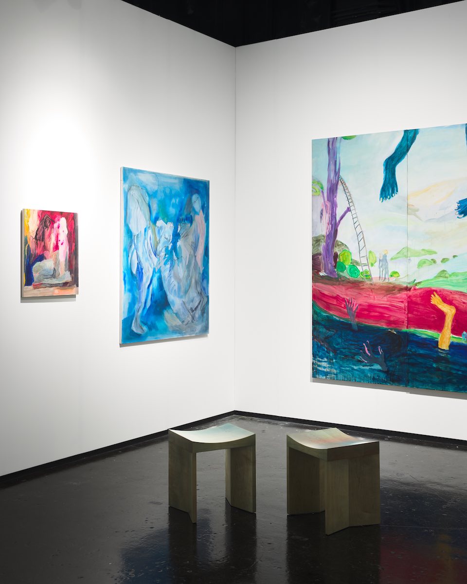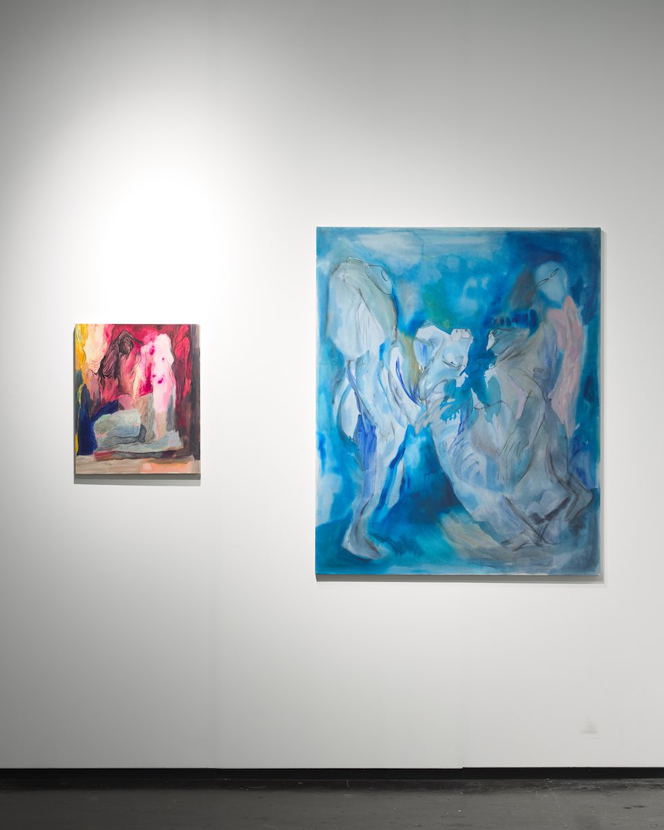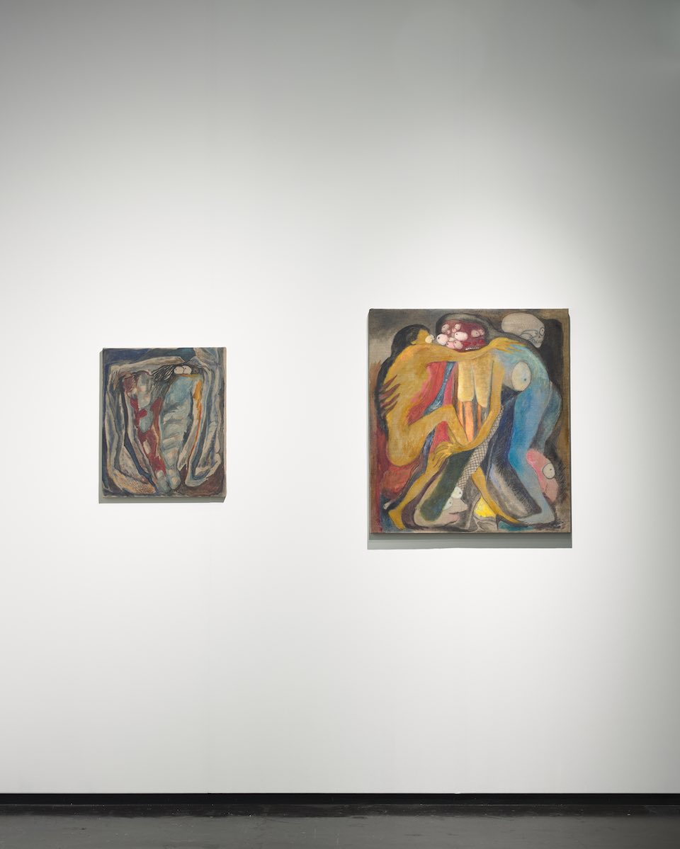 Flanking this monumental work is a selection of paintings and drawings from El fuego que no produce (The Fire That Does Not Ignite), 2023, Vidales’ first solo exhibition in Mexico, continuing her engagement with towering figures of Mexican modernism and the complex dynamics of power, legacy, and resistance.